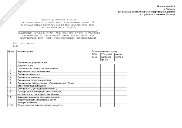 Реестр документов и актов для сдачи-приемки документации, материальных ценностей и согласованных обязательств по многоквартирному дому, подлежащих передаче от МУП «УЕЗ ЖКХ» или другой управляющей организации, осуществляющей управление и техническое обслуживание дома, лицу, уполномоченному собственниками (рекомендуемый образец заполнения)