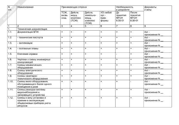 Реестр документов и актов для сдачи-приемки документации, материальных ценностей и согласованных обязательств по многоквартирному дому в г. Москве при смене организации, управляющей многоквартирным домом (рекомендуемый образец заполнения)