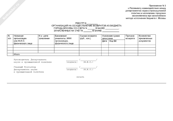 Реестр организаций на осуществление возвратов из бюджета города Москвы (рекомендуемый образец заполнения)