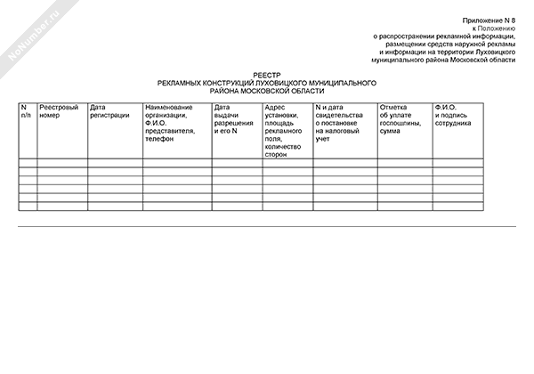 Реестр рекламных конструкций Луховицкого муниципального района Московской области (рекомендуемый образец заполнения)