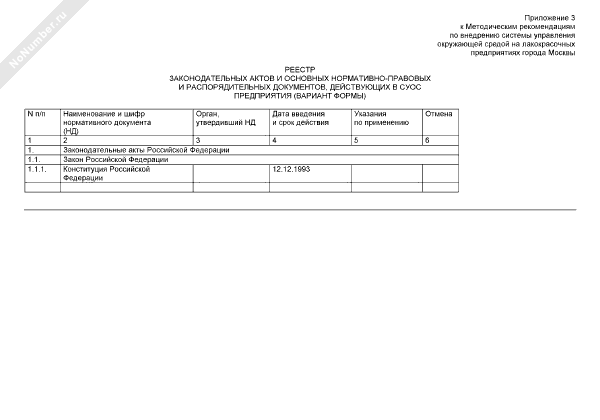 Реестр законодательных актов и основных нормативно-правовых и распорядительных документов, действующих в системе управления окружающей средой лакокрасочного предприятия города Москвы (вариант формы)