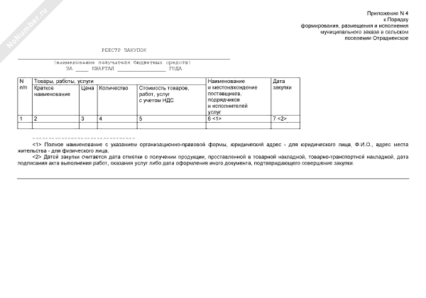 Реестр закупок для муниципальных нужд сельского поселения Отрадненское Московской области (рекомендуемый образец заполнения)