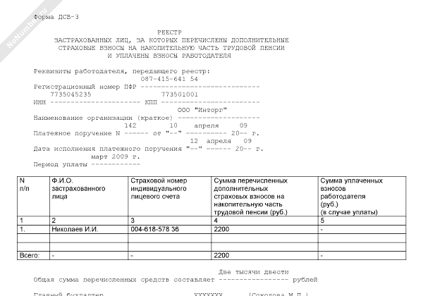 Реестр застрахованных лиц, за которых перечислены дополнительные страховые взносы на накопительную часть трудовой пенсии и уплачены взносы работодателя. Форма № ДСВ-3 (рекомендуемый образец заполнения)