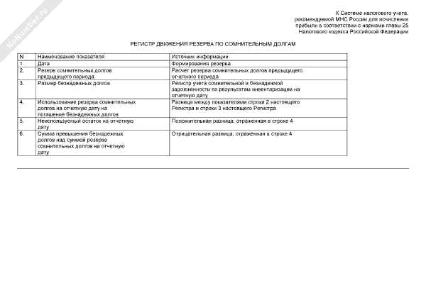 Регистр движения резерва по сомнительным долгам (рекомендуемый образец заполнения)