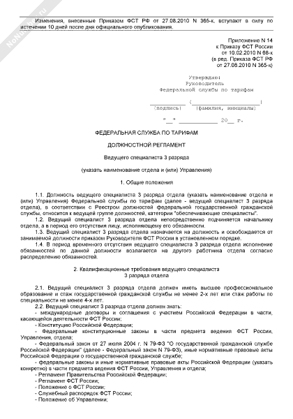 Должностной регламент ведущего специалиста 3 разряда отдела Федеральной службы по тарифам (рекомендуемый образец заполнения)