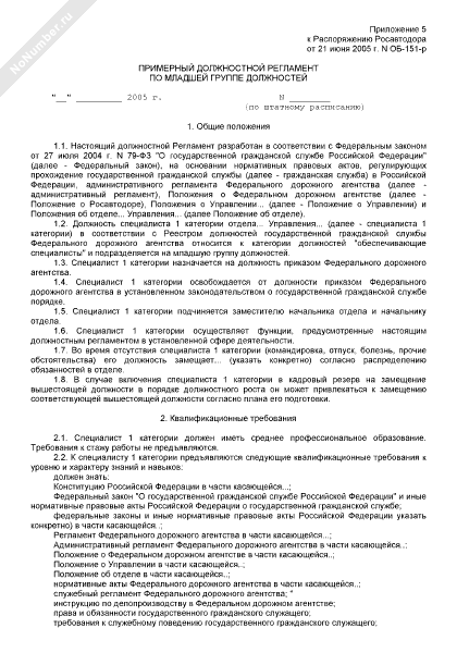 Примерный должностной регламент по младшей группе должностей федерального дорожного агентства (рекомендуемый образец заполнения)