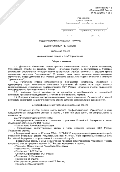 Должностной регламент начальника отдела Федеральной службы по тарифам
