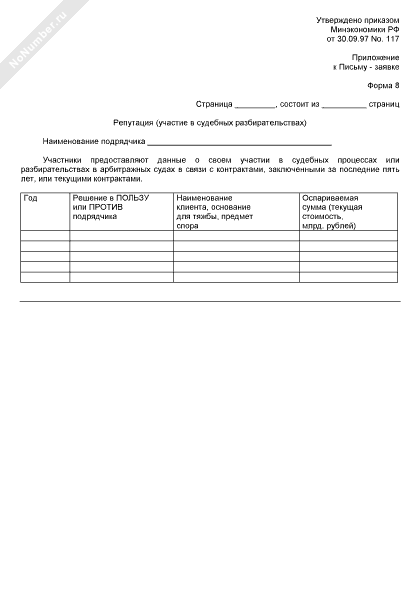 Репутация (участие в судебных разбирательствах (приложение к письму-заявке на участие в предварительном квалификационном отборе подрядчиков для последующего участия в торгах (конкурсе)) (форма № 8)