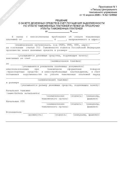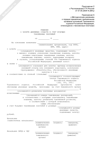 - 252Решение о зачете денежных средств в счет будущих таможенных платежей (приложение к методическим указаниям о порядке применения таможенными органами положений Таможенного кодекса Российской Федерации, относящихся к таможенным платежам)