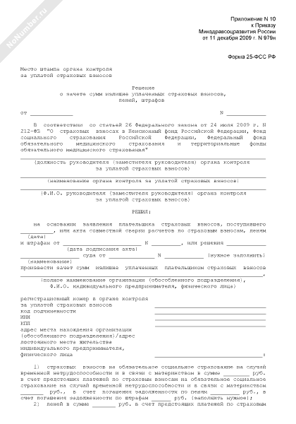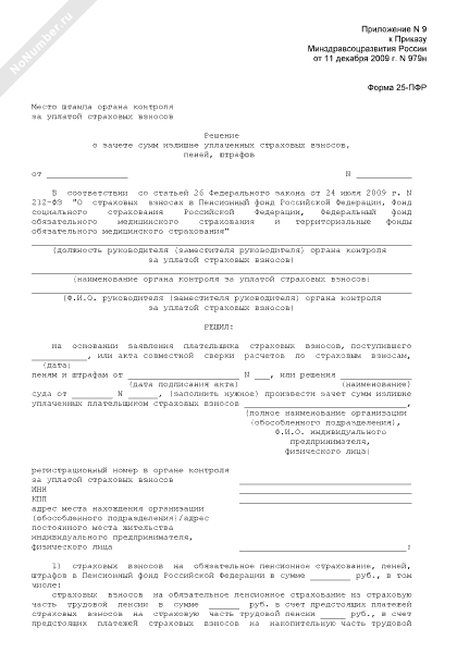 - 255Решение о зачете сумм излишне уплаченных страховых взносов на обязательное пенсионное страхование, пеней, штрафов в Пенсионный фонд РФ, страховых взносов на обязательное медицинское страхование, пеней, штрафов в Федеральный фонд обязательного медицинского страхования (территориальный фонд обязательного медицинского страхования). Форма № 25-ПФР