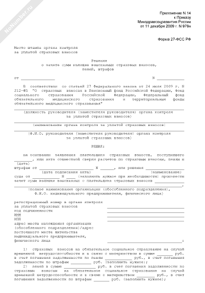 - 258Решение о зачете сумм излишне взысканных страховых взносов, пеней, штрафов на обязательное социальное страхование на случай временной нетрудоспособности и в связи с материнством. Форма № 27-ФСС РФ