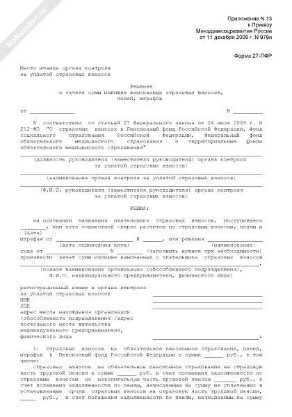 - 257Решение о зачете сумм излишне взысканных страховых взносов, пеней, штрафов на обязательное пенсионное страхование, пеней, штрафов в Пенсионный фонд РФ, страховых взносов на обязательное медицинское страхование, пеней, штрафов в Федеральный фонд обязательного медицинского страхования (территориальный фонд обязательного медицинского страхования) в счет погашения задолженности по страховым взносам на обязательное медицинское страхование. Форма № 27-ПФР