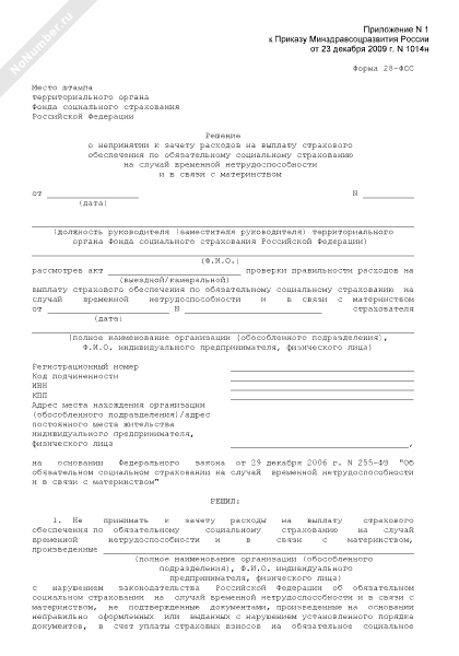 - 281Решение о непринятии к зачету расходов на выплату страхового обеспечения по обязательному социальному страхованию на случай временной нетрудоспособности и в связи с материнством. Форма № 28-ФСС