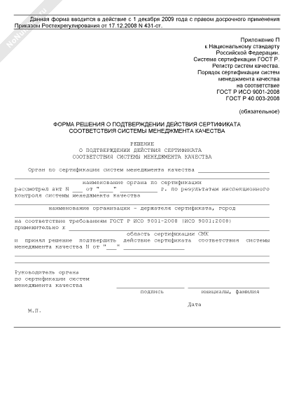 - 287Решение о подтверждении действия сертификата соответствия системы менеджмента качества (обязательная форма)