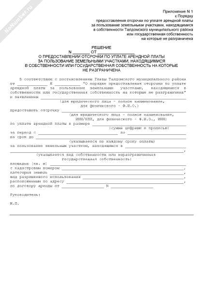 - 292Решение о предоставлении отсрочки по уплате арендной платы за пользование земельными участками, находящимися в собственности Талдомского муниципального района или государственная собственность на которые не разграничена