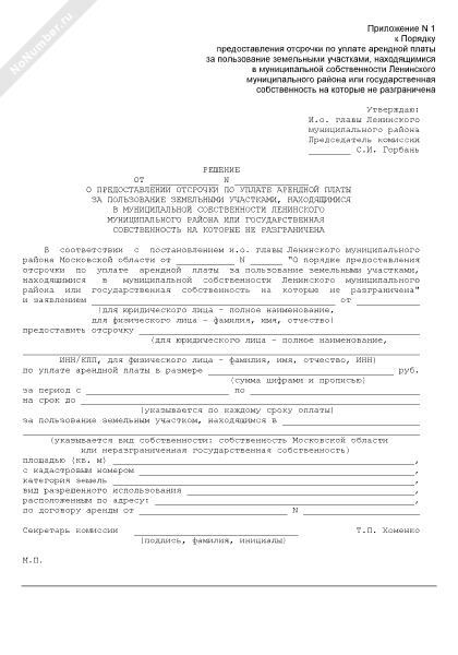 - 291Решение о предоставлении отсрочки по уплате арендной платы за пользование земельными участками, находящимися в муниципальной собственности Ленинского муниципального района Московской области или государственная собственность на которые не разграничена
