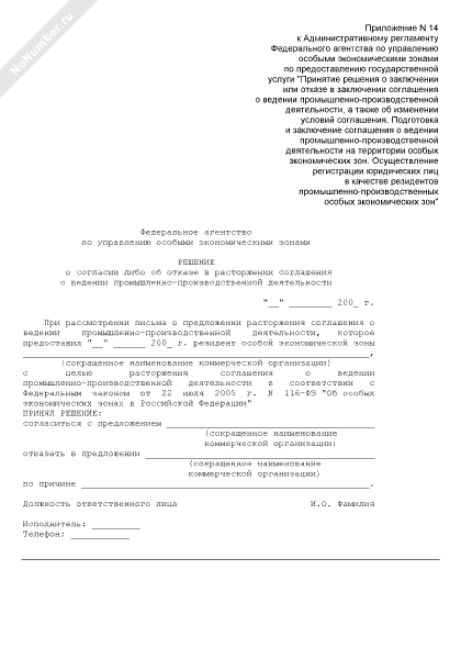 - 425Решение о согласии либо об отказе в расторжении соглашения о ведении промышленно-производственной деятельности на территории особой экономической зоны