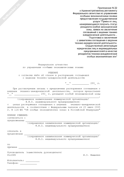 - 424Решение о согласии либо об отказе в расторжении соглашения о ведении технико-внедренческой деятельности особой экономической зоны