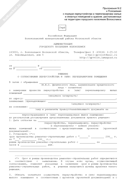 - 429Решение о согласовании переустройства и (или) перепланировки помещения в здании, расположенном на территории городского поселения Волоколамск Московской области