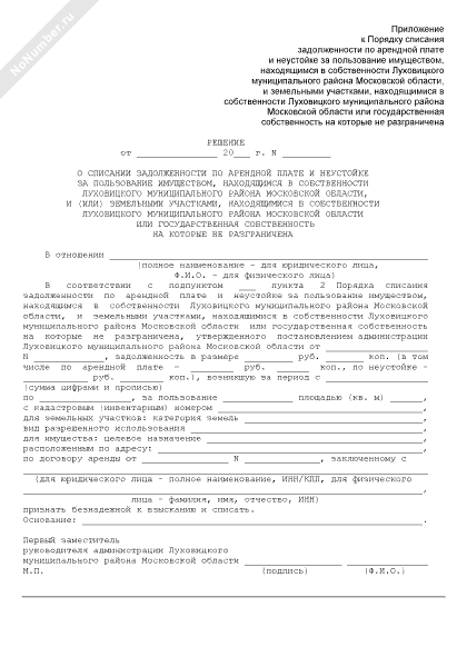 - 431Решение о списании задолженности по арендной плате и неустойке за пользование имуществом, находящимся в собственности Луховицкого муниципального района Московской области, и (или) земельными участками, находящимися в собственности Луховицкого муниципального района Московской области или государственная собственность на которые не разграничена