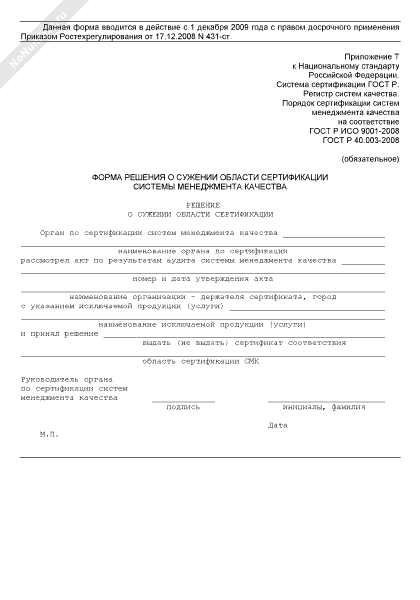 - 438Решение о сужении области сертификации системы менеджмента качества (обязательная форма)