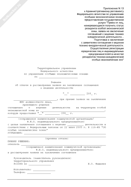 - 499Решение об отказе в рассмотрении заявки на заключение соглашения о ведении технико-внедренческой деятельности особой экономической зоны
