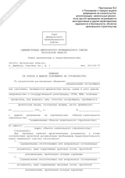- 484Решение об отказе в выдаче разрешения на строительство на территории Дмитровского муниципального района Московской области