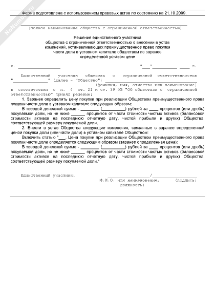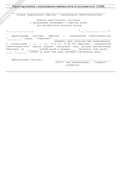 - 96Решение единственного участника общества с ограниченной ответственностью об определении цены продажи долей, приобретенных обществом
