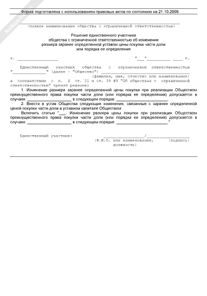 - 88Решение единственного участника общества с ограниченной ответственностью об изменении размера заранее определенной уставом цены покупки части доли в уставном капитале общества или порядка ее определения