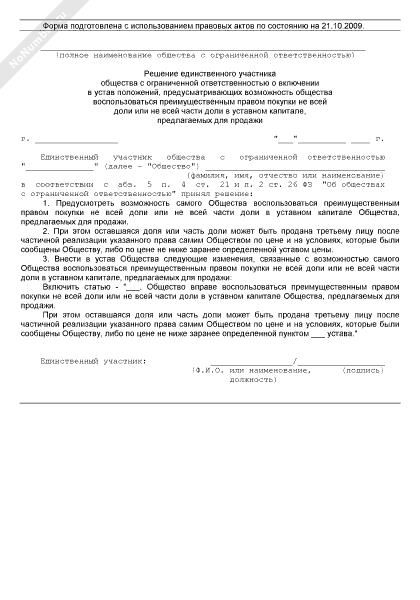- 90Решение единственного участника общества с ограниченной ответственностью об исключении из устава положений, предусматривающих возможность общества воспользоваться преимущественным правом покупки не всей доли или не всей части доли в уставном капитале, предлагаемых для продажи