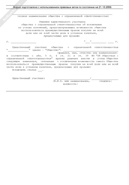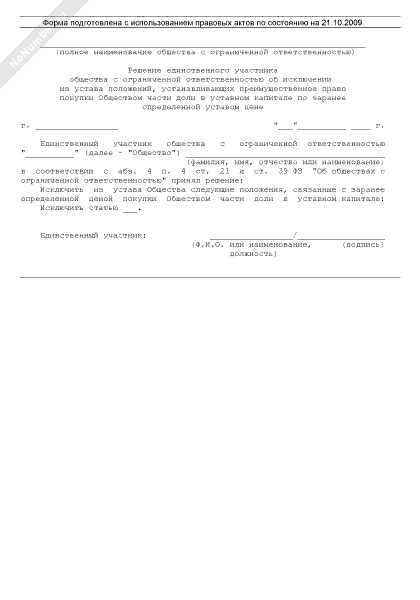 - 94Решение единственного участника общества с ограниченной ответственностью об исключении из устава положений, устанавливающих преимущественное право покупки обществом части доли в уставном капитале по заранее определенной уставом цене