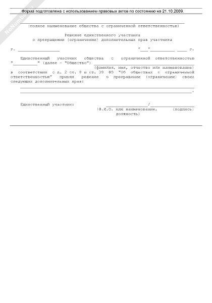 - 91Решение единственного участника общества с ограниченной ответственностью о прекращении (ограничении) дополнительных прав участника