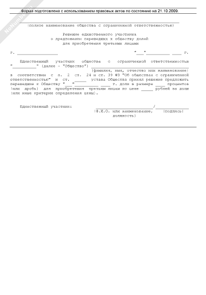 - 95Решение единственного участника общества с ограниченной ответственностью о предложении перешедших к обществу долей для приобретения третьими лицами