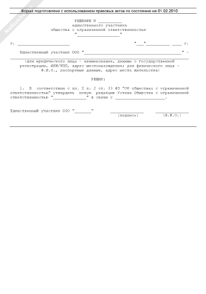 - 99Решение единственного участника общества с ограниченной ответственностью об утверждении устава общества в новой редакции