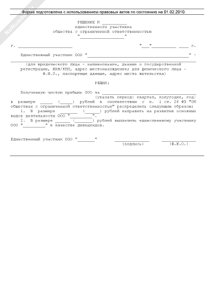 - 100Решение единственного участника общества с ограниченной ответственностью о распределении прибыли общества с ограниченной ответственностью