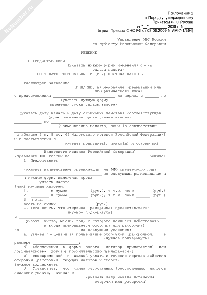 Решение Федеральной налоговой службы о предоставлении отсрочки (рассрочки) по уплате региональных и (или) местных налогов юридическому (физическому) лицу