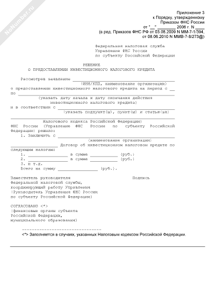 Решение Федеральной налоговой службы о предоставлении инвестиционного налогового кредита юридическому лицу (рекомендуемый образец заполнения)