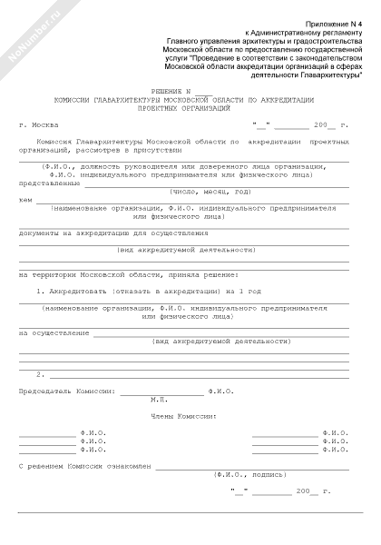 Решение комиссии Главархитектуры Московской области по аккредитации проектных организаций (рекомендуемый образец заполнения)