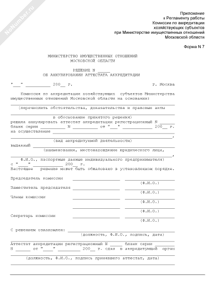 Решение комиссии по аккредитации хозяйствующих субъектов при Министерстве имущественных отношений Московской области об аннулировании аттестата аккредитации хозяйствующего субъекта (форма № 7)