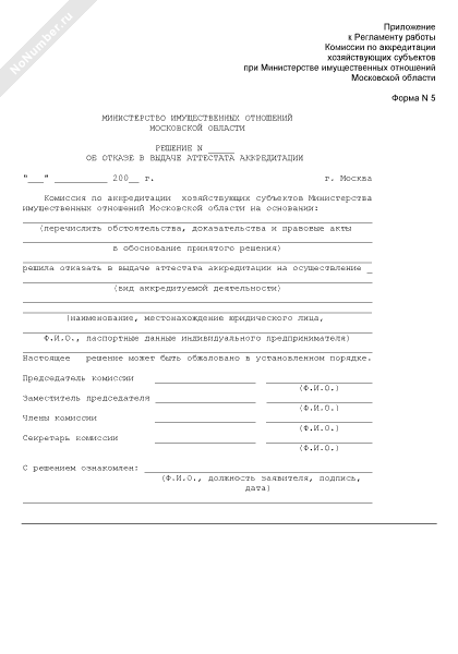 Решение комиссии по аккредитации хозяйствующих субъектов при Министерстве имущественных отношений Московской области об отказе в выдаче аттестата аккредитации хозяйствующему субъекту (форма № 5)
