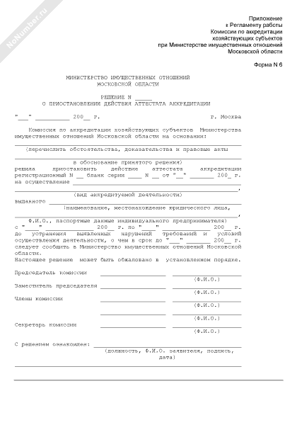 Решение комиссии по аккредитации хозяйствующих субъектов при Министерстве имущественных отношений Московской области о приостановлении действия аттестата аккредитации хозяйствующего субъекта (форма № 6)