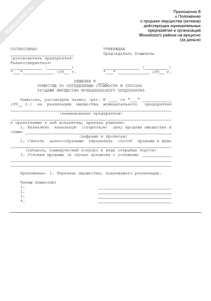 Решение комиссии по определению стоимости и способа продажи имущества муниципального предприятия на территории Можайского района (рекомендуемый образец заполнения)