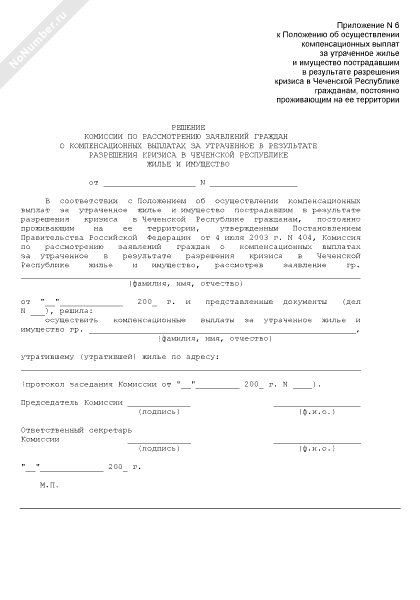 Решение комиссии по рассмотрению заявлений граждан о компенсационных выплатах за утраченное в результате разрешения кризиса в Чеченской Республике жилье и имущество (рекомендуемый образец заполнения)