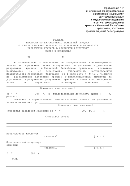 Решение комиссии по рассмотрению заявлений граждан об отказе в компенсационных выплатах за утраченное в результате разрешения кризиса в Чеченской Республике жилье и имущество (рекомендуемый образец заполнения)