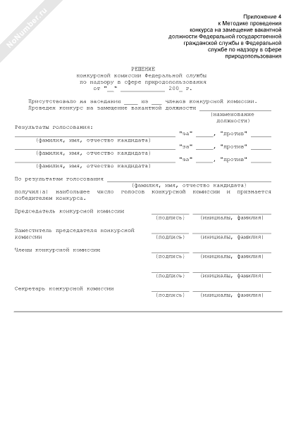 Решение конкурсной комиссии Федеральной службы по надзору в сфере природопользования о признании победителем конкурса на замещение вакантной должности (рекомендуемый образец заполнения)