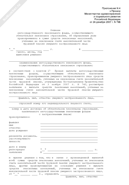 Решение негосударственного пенсионного фонда, осуществляющего обязательное пенсионное страхование, об определении доли правопреемника в сумме средств пенсионных накоплений, учтенных на пенсионном счете накопительной части трудовой пенсии умершего застрахованного лица (рекомендуемый образец заполнения)