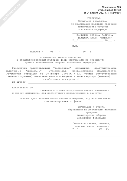 Решение о включении жилого помещения в специализированный жилищный фонд (исключении из указанного фонда) Министерства обороны Российской Федерации