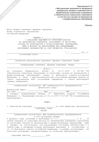 Решение о взыскании недоимки по страховым взносам на обязательное социальное страхование от несчастных случаев на производстве и профессиональных заболеваний, пени и штрафов за неисполнение или ненадлежащее исполнение обязанностей за счет имущества страхователя (рекомендуемый образец заполнения)