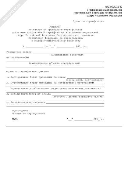 Решение по заявке на проведение сертификации в системе добровольной сертификации в жилищно-коммунальной сфере Российской Федерации Государственного комитета Российской Федерации по строительству и жилищно-коммунальному комплексу (рекомендуемый образец заполнения)