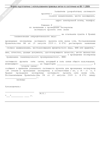 Решение по заявлению о проведении экспертизы системного проекта сети связи (рекомендуемый образец заполнения)